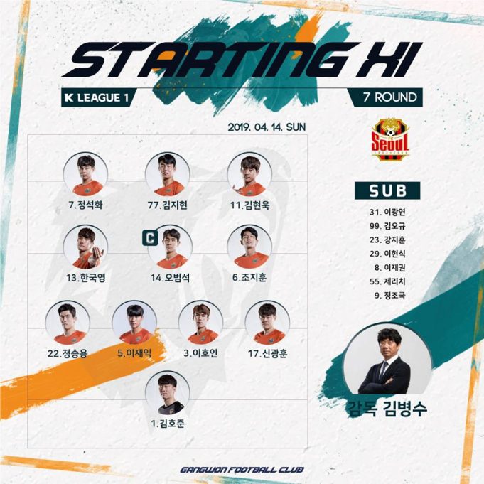 강원FC는 14일 춘천송암에서 열리는 2019 하나원큐 K리그1 7라운드 서울전을 맞아 4-3-3의 포메이션을 사용한다.