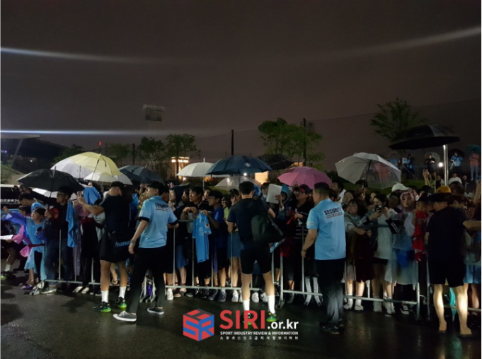궂은 비 속에 선수들을 기다리고 있는 팬들 / 사진=스포츠미디어 시리