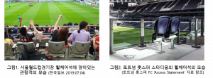 A . K리그의 경기장은 휠체어 석의 개수만 충분할 뿐, 실제 장애인 관람객의 편의를 고려한 설계가 확실히 보이지 않았다. 그림1의 휠체어 석에 앉아있는 관람객들의 모습을 살펴보면, 관람석의 가장 뒤편에 휠체어 석이 마련되어 있는 것을 알 수 있다. 또한 사진 속 어린이 관람객의 모습을 보면, 휠체어 석 앞에 놓인 안전 펜스로 인해 시야가 가려지는 것이 보인다. 물론 관람객의 안전을 위해 설치한 구조물이므로 어쩔 수 없다고 생각할 수도 있겠지만, 장애인 관람객의 편의를 극대화하기 위한 대안을 고려하지 않았다는 점에서 시설 설계의 한계가 드러난다. 반면, 토트넘의 홈구장인 홋스퍼 스타디움은 휠체어 석의 위치를 좌석 앞쪽에 배치함으로써 장애인 관람객의 편의를 극대화하였다. 또한 그림2를 보면 휠체어 석 앞에 놓여있는 안전펜스가 투명하게 만들어져 있는 것이 보인다. 이러한 설계 방식은 장애인 관람객의 시야 방해를 최소화했다는 점에서 K리그의 경기장과 비교된다.