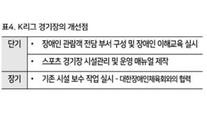 K리그 경기장은 PL 경기장보다 경기장 내 장애인 편의시설을 비교적 잘 갖추고 있는 편이다. 그러나 그것이 실제 장애인 관람객의 경기장 방문으로 이어지기 위해서는, 장애인 관람객의 편의를 증대할 수 있는 다양한 서비스가 제공되어야 한다. 김고은 씨와 두 리그의 경기장을 비교 분석한 결과를 바탕으로 K리그 경기장의 장애인 관람객을 위한 인적, 물적 서비스 면에서 살펴보았다.