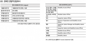 반면 경기장 소유권을 가진 PL팀들의 경우, 표3과 같이 구단별로 장애인 관람객 전담 부서를 구성하고 있다. 그리고 이러한 정보는 구단 공식 홈페이지에 명확히 게재되어 있으며, 필요에 따라 담당자와의 상담도 가능하다. 또한, 경기 당일에는 부서의 직원들이 경기장에 상주하며 장애인 관람객들을 돕고 있다. 한 가지 사례를 들자면 에버턴FC의 홈구장인 구디슨 파크에서는 장애인 관람객을 위한 주차장 픽업 서비스를 진행하고 있다. 이에 따라 휠체어를 탄 관람객은 부서 직원의 도움을 받아 주차장에서 경기장까지 편히 이동할 수 있는 장점이 있다. 이와 같은 체계적인 시스템은 장애인 관람객이 경기장을 방문했을 때 불편함을 최소화할 수 있다는 점에서 효과적이다. 또한 이러한 전담부서를 통해 장애인 관람객은 경기장 내 이동권과 접근성을 보장받을 수 있고, 이후 경기장을 재방문하고자 하는 긍정적인 동기로 작용할 수 있다.