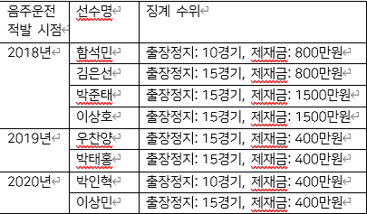 음주운전 적발 시점 선수명 징계 수위