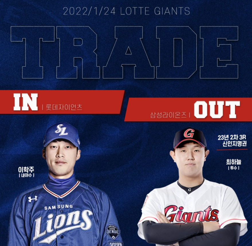 프로야구 삼성 라이온즈의 내야수 이학주가 롯데 투수 최하늘과 2023 KBO리그 신인드래프트 2차 3라운드 지명권의 1대 2 맞트레이드를 통해 롯데로 이적한다.