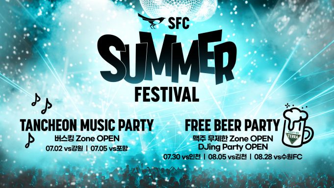 페스티벌은 ‘탄천 뮤직파티’와 ‘프리 비어파티’ 2부에 걸쳐 진행되며 탄천종합운동장을 방문한 관중들이 여름 더위를 날려 버릴 수 있도록 꾸몄다. 오는 7월 2일 강원전을 시작으로 5일(포항전), 30일(인천전) 등 5차례 열린다.