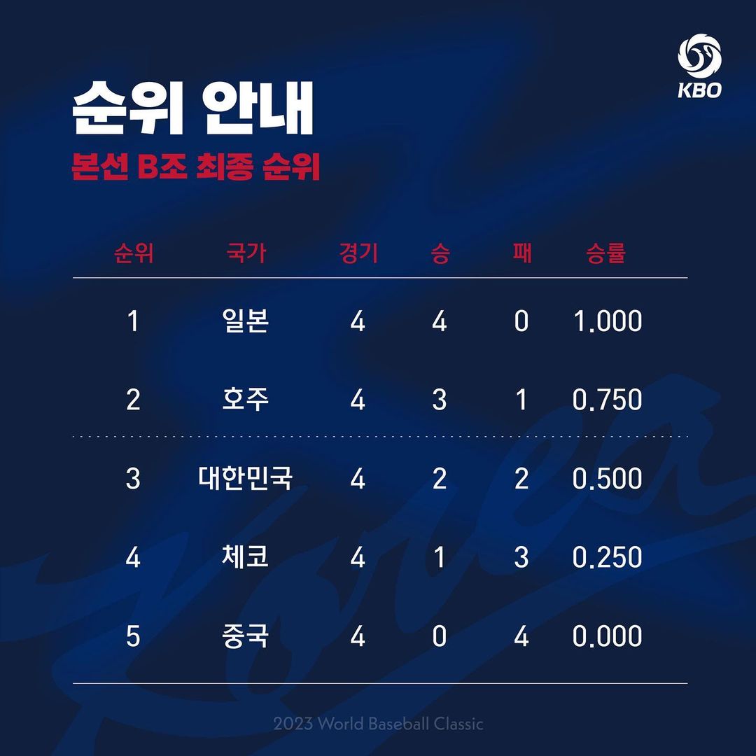 한국 대표팀은 체코가 호주전에서 4실점 이상 기록하면서 승리해야 조 2위를 노려볼 수 있었지만, 호주가 오늘(13일) 일본 도쿄 도쿄돔에서 열린 대회 1라운드 B조 최종 4차전에서 체코를 8-3으로 꺾고 일본과 함께 8강에 진출하면서 오늘(13일) 저녁 중국전 결과에 관계없이 탈락이 확정됐다. 체코는 3승 1패를 기록하며 4전 전승을 기록한 일본에 이어 조 2위로 사상 처음 8강에 진출했다.