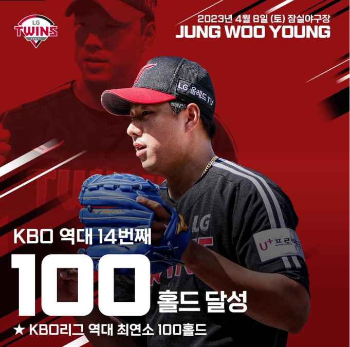 서울고 출신 정우영은 23세 7개월 20일로 정우람(한화이글스)이 보유했던 25세 11개월 17일보다 약 2년 앞선 KBO리그 최연소 100홀드의 주인공이 됐다.