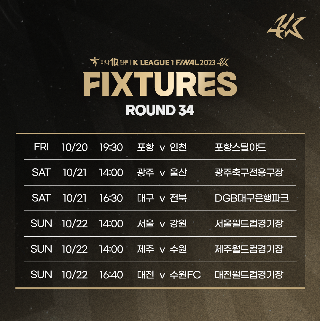 [SIRI = 현계원 기자] 한국프로축구연맹(총재 권오갑)이 하나원큐 K리그1 2023 파이널 라운드 일정을 발표했다. 파이널 라운드는 34라운드부터 최종 38라운드까지 각 팀별로 5경기씩 치른다. 파이널A에 진출한 6개 팀은 우승과 AFC챔피언스리그 진출권을 획득하기 위한 경쟁을, 파이널B에 속한 6개 팀은 강등을 피하기 위한 경쟁을 벌이게 된다.