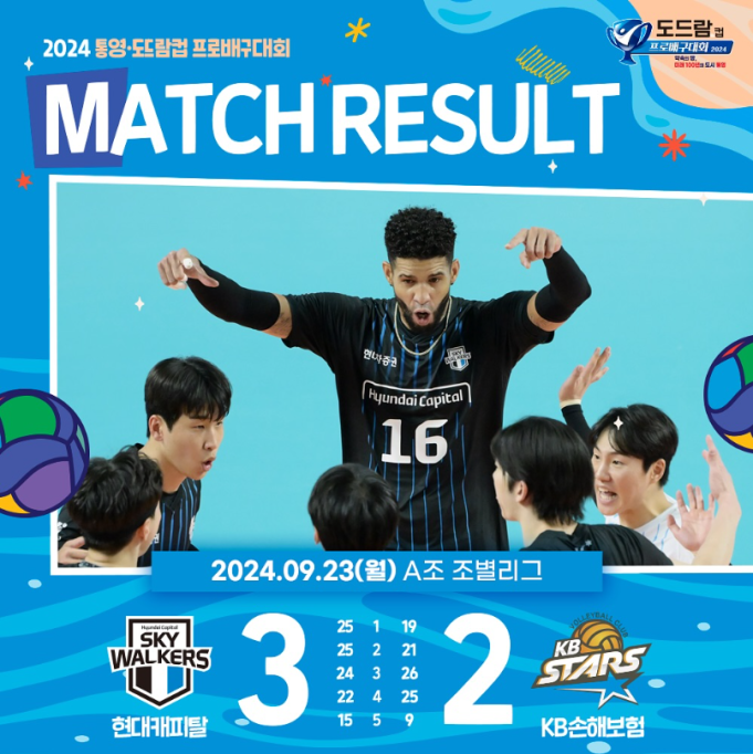 현대캐피탈은 23일 경남 통영체육관에서 열린 2024 통영·도드람컵 프로배구대회 남자부 A조 2차전에서 KB손해보험에 3-2(25-19 25-21 24-26 22-25 15-9)로 승리했다.