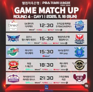 프로당구(PBA) 팀리그 ‘웰컴저축은행 PBA 팀리그 2025-2026’ 4라운드가 16일부터 9일간 경기도 고양 킨텍스 PBA 스타디움에서 열린다. 이미 하나카드(1라운드 우승), 웰컴저축은행(2라운드 우승), SK렌터카(3라운드 우승)가 라운드 챔피언 자격으로 PS 진출을 확정했고, 나머지 7개 팀이 남은 라운드 성적과 종합 순위를 걸고 치열한 순위 싸움에 돌입한다.