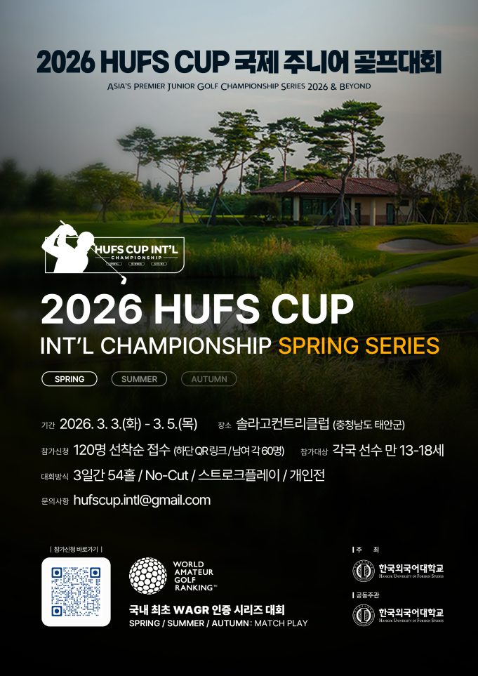 [SIRI=임민정 기자] 한국외국어대학교(HUFS)의 글로벌 정신을 계승하고 아시아 엘리트 주니어 골프의 새로운 기준을 제시할 ‘2026 HUFS CUP INTERNATIONAL CHAMPIONSHIP’이 오는 3월 그 화려한 막을 올린다. 이번 대회는 전 세계 다양한 문화와 인재들이 골프라는 스포츠를 통해 하나로 연결되는 국제적인 화합의 장으로 기획되었다.